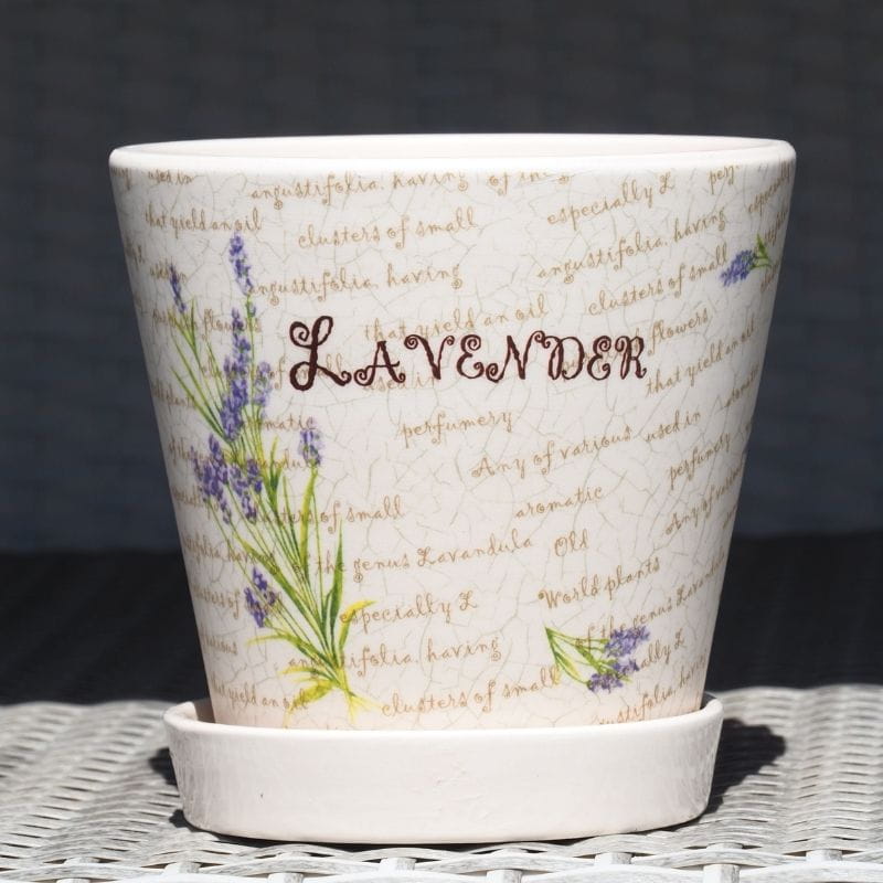 ✅ doniczka zdobiona delikatnym, prowansalskim wzorem z lawendą i napisami