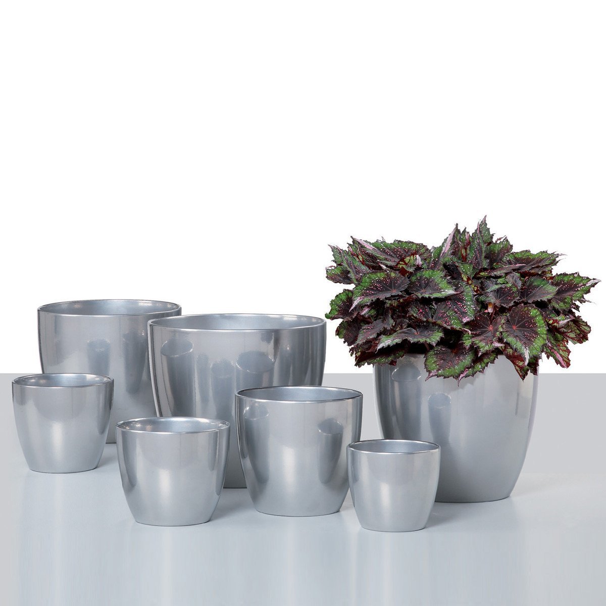 Srebrna doniczka ceramiczna dostępna jest w różnych rozmiarach: