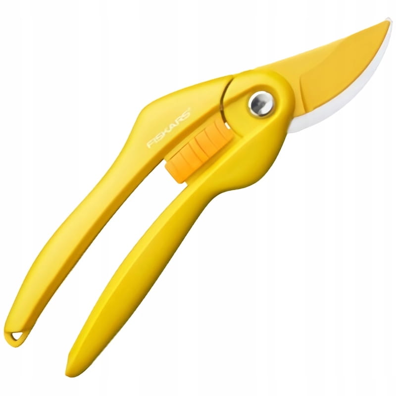 Żółty sekator ogrodowy nożycowy Fiskars Saffron szafran z podwójnym ostrzem